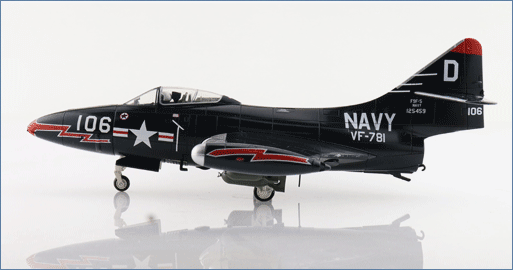 The F9F Panther entered service in 1949. It was the first Grumman jet fighter, first Carrier-Borne Navy jet fighter in combat, first USN jet to shoot down an enemy airplane, first jet aircraft used by the Blue Angels. A total of 1,382 F9Fs were made. VF-781 was the first squadron to volunteer for combat in Korea and were 100% volunteers earning them the name “Pacemakers”. The F9F flew 78,000 sorties with VF-781 flying 2,721 of them without a single loss of life. The Panther was removed from front-line service in 1956